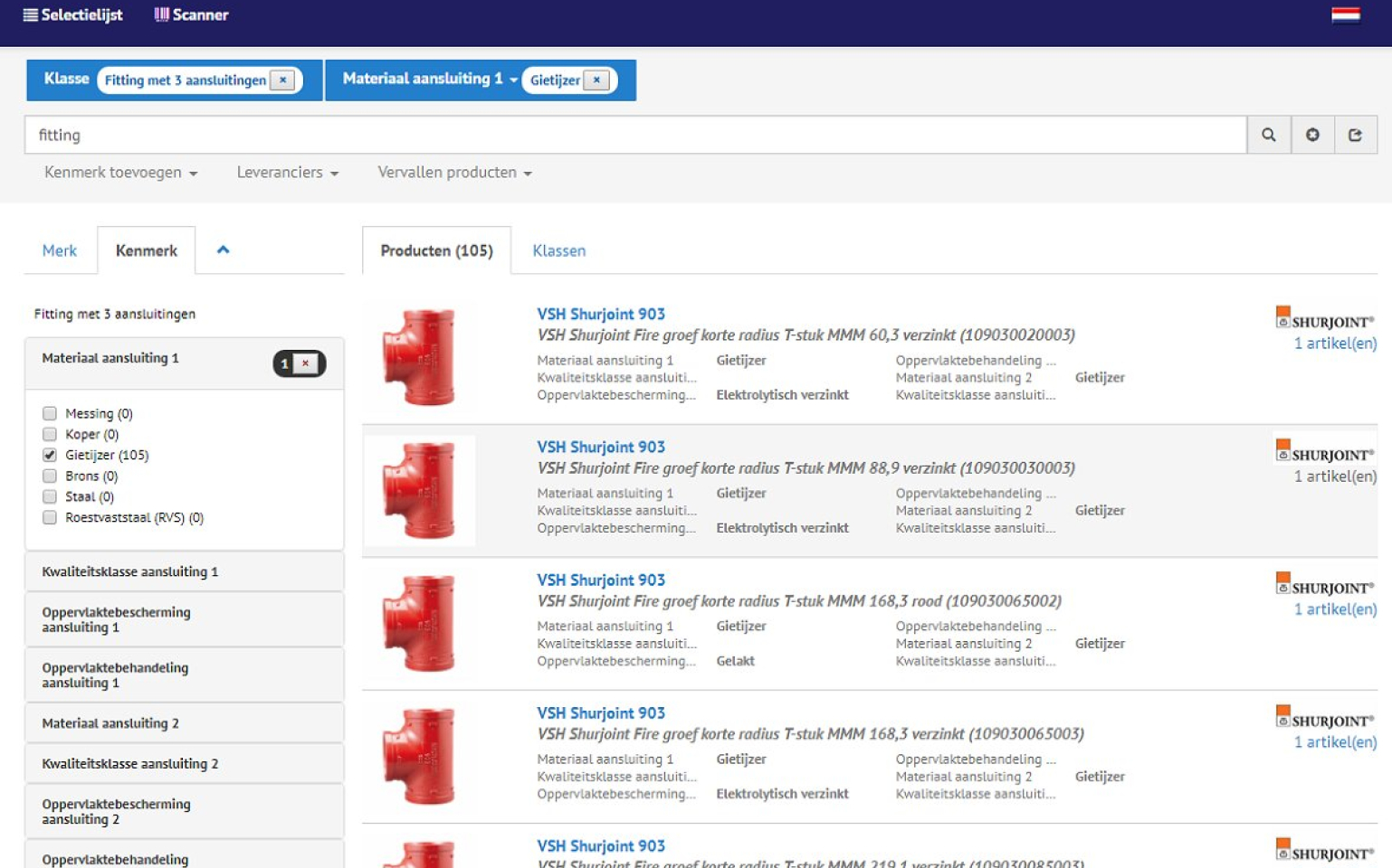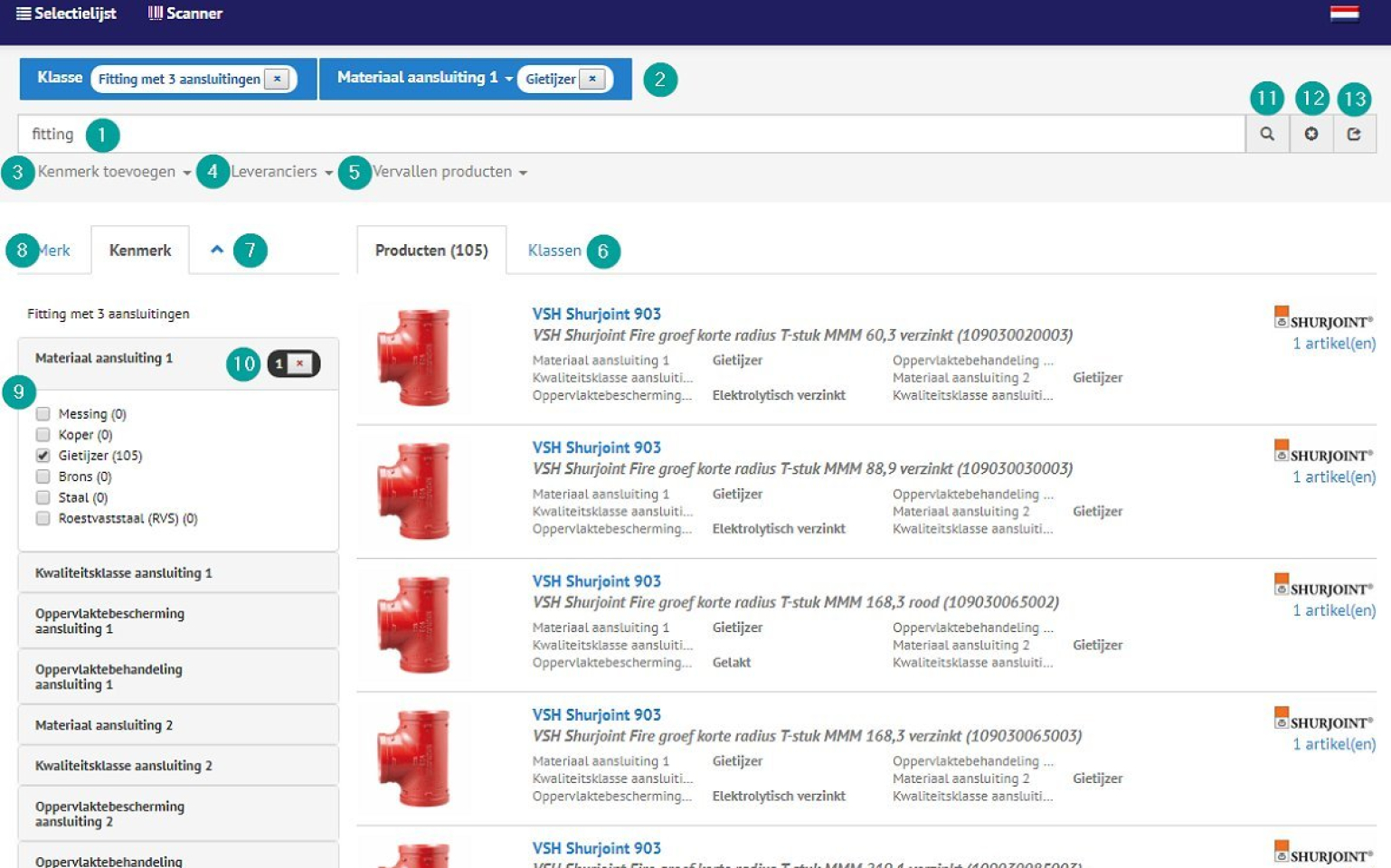 Standaard wordt gezocht binnen alle leveranciers. U kunt de zoekopdracht beperken tot een specifieke leverancier. Ingelogde gebruikers kunnen ook zoeken binnen “Mijn leveranciers”, een gepersonaliseerde lijst.